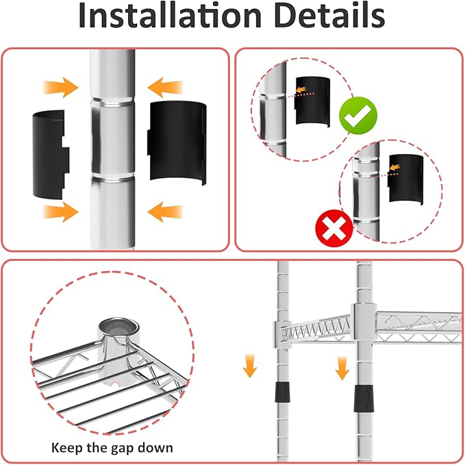 - 【Easy Assembly】The wire shelves with wheels is easy to assemble, does not require any tools, and the height of each layer can be adjusted according to needs, just clamp the metal grid plate on the column, and then slide the metal grid plate along the column until the metal shelf is firmly fixed on the buckle. The shelving with wheels also comes with a user manual to guide you through the quick and easy assembly process.