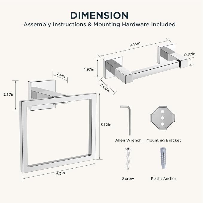 - Easy to Install: Installation is a breeze with our bathroom hardware set. The package comes with an allen wrench, hardware kit, and step-by-step instructions, ensuring you can quickly set up your new Toilet Paper Holder and towel ring