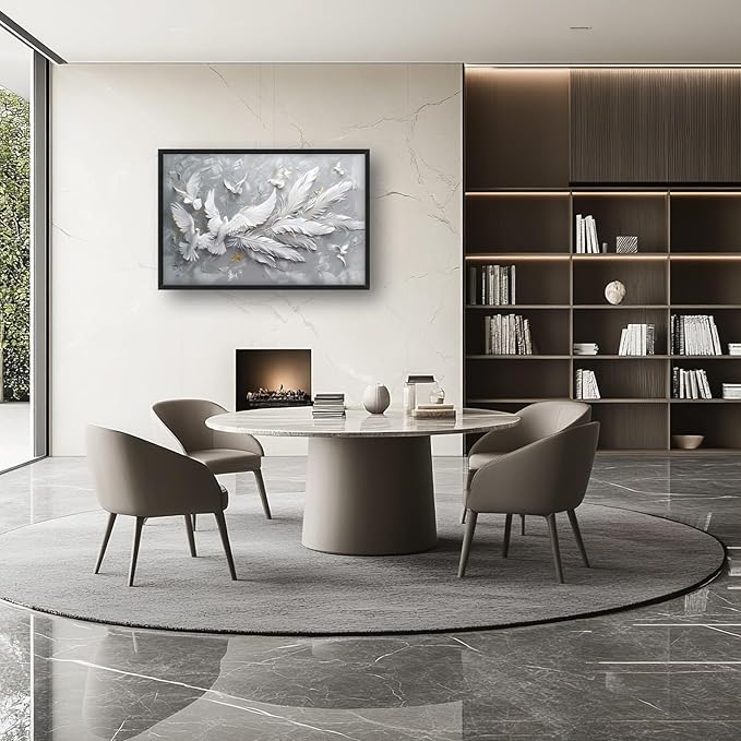 - 【Unique Design】3D abstract painting of white doves with long feathers, flying in the air. The background is gray and textured. There should be no shadows on it. In front, there will also be other light-colored birds, and they can have different shapes. Together, they form an artistic composition that symbolizes peace or freedom. White feathers on wings, full-length, high detail.