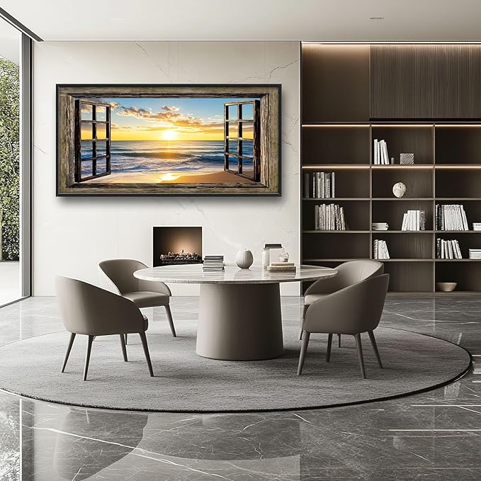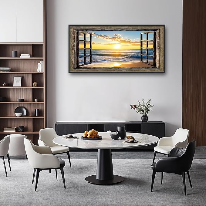 - 【Unique Design】A window frame with an ocean and sunset view, a beach scene with wooden frames, wall art for home decor, a beach landscape with open windows, photo-realistic, hyperrealism, high resolution.