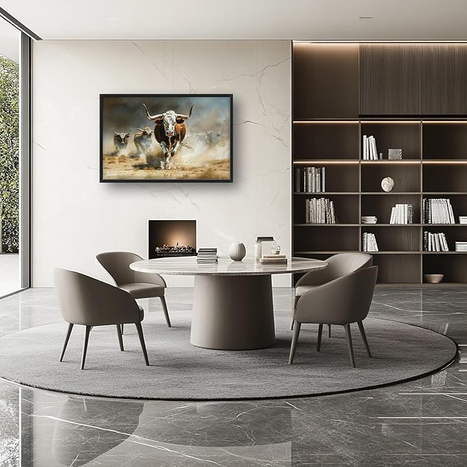 - 【Unique Design】An oil painting of longhorn cattle running through a dusty landscape, realistic and cinematic in style.