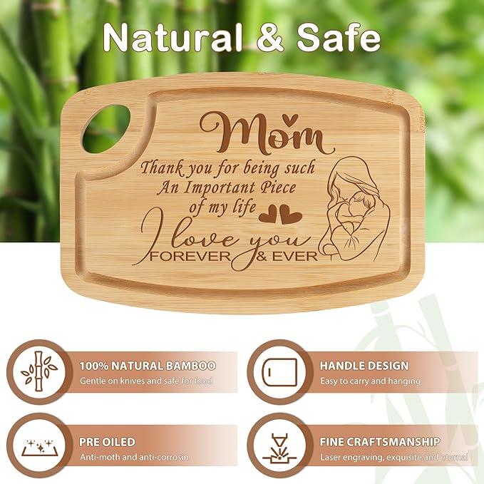 - Personalized Mother’s Day Gift - Etched with “Thank You for Being sure an Important Piece of my life” and a tender mother-child embrace, this wooden cutting board is more than a tool – it’s a daily love letter. The oval hanging hole lets mom display it as wall art above her coffee station, transforming kitchen chores into daily reminders of your love. This is will be a gift that turns kitchen chores into heartfelt moments