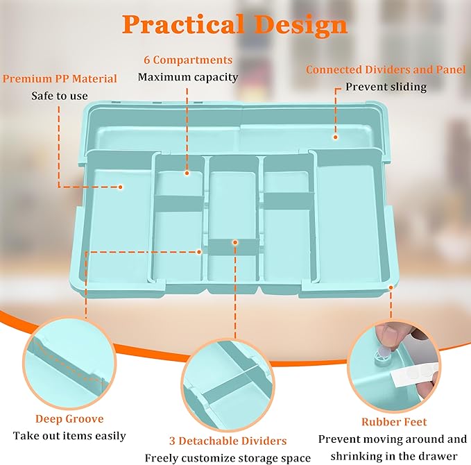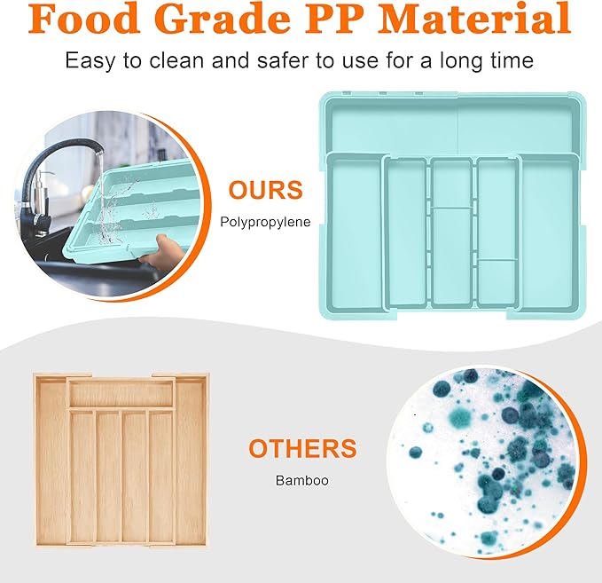- Premium Food Grade Material: Our utensil drawer organizer is made of thick and sturdy food-grade PP material, ensuring long-lasting use. It is also BPA-free, keeping your kitchen utensils safe for your family’s health.Cleaning is a breeze – simply rinse with water or wipe clean with a cloth to remove stains. Avoid using a dishwasher.