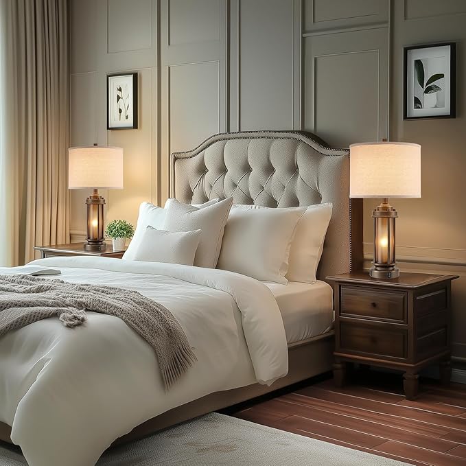 Set of 2 Farmhouse Table Lamps for Living Room, Rustic Vintage Bedside Lamps with 2 USB Ports, Bedroom Nightstand Lamp with Amber Glass Nightlight for End Table Entryway, 4 Bulbs Includes