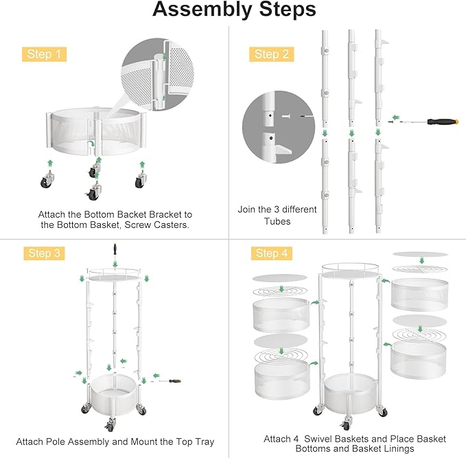 - [Rotating Storage Rack] The rotating fruit basket is designed with 360° swivel wheels and 270° rotating basket, which is more convenient to take or place items from any direction. The high fence of 5.1" protects the goods from falling down while increasing the storage space. Please watch our installation video before starting the assembly process, it will help you complete the assembly quickly and easily