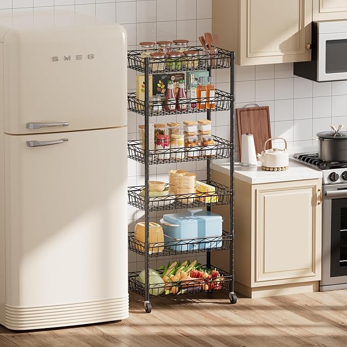- Features: This shelf is designed with metal mesh baskets to prevent items from falling, each layer height is adjustable to accommodate items of different sizes, and it with wheels for easy mobility.