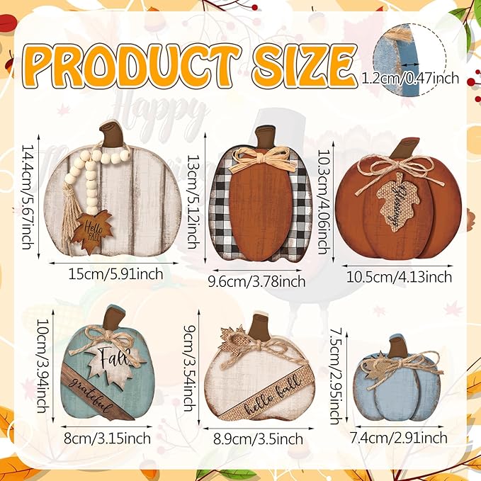 - Suitable Size: each hello fall pumpkin wooden table decoration is a different size, the largest is 5.91 x 5.67 inches and the smallest is 2.95 x 2.91 inches, their size is suitable for placing on tables and cabinets