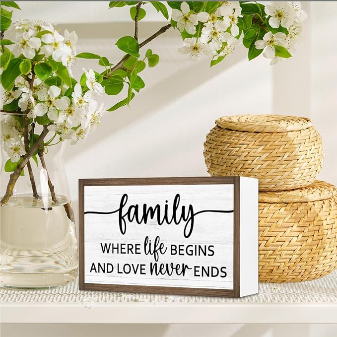 Family Where Life Begins and Love Never Ends Wooden Box Sign Desk Decor,Family Saying Wood Block Sign for Home Farmhouse Bedroom Shelf Tabletop Wall Decor