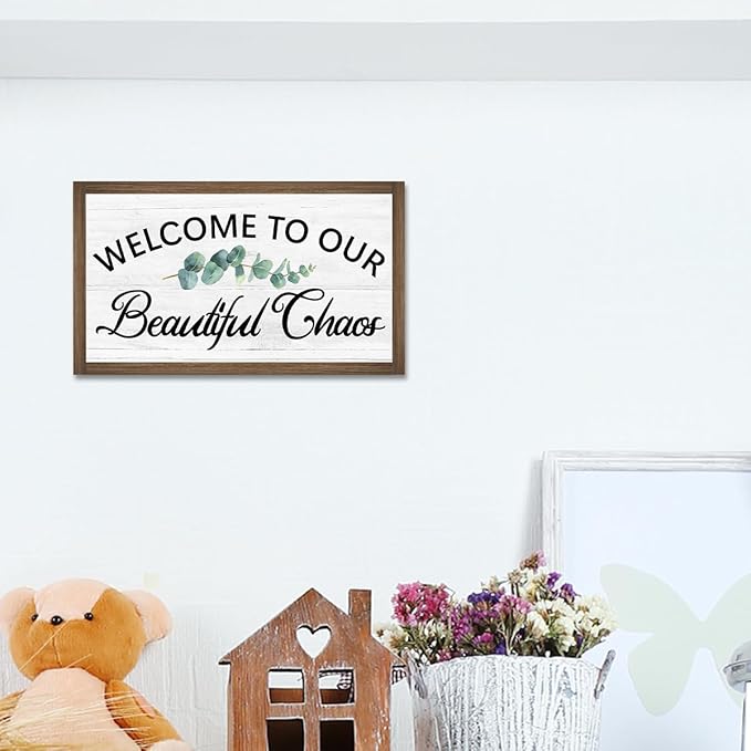 Welcome to Our Beautiful Chaos Wooden Box Sign Desk Decor,Rustic Family Saying Wood Block Sign for Home Farmhouse Bedroom Shelf Tabletop Wall Decor