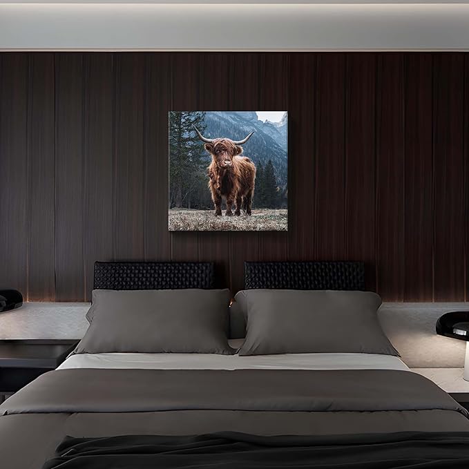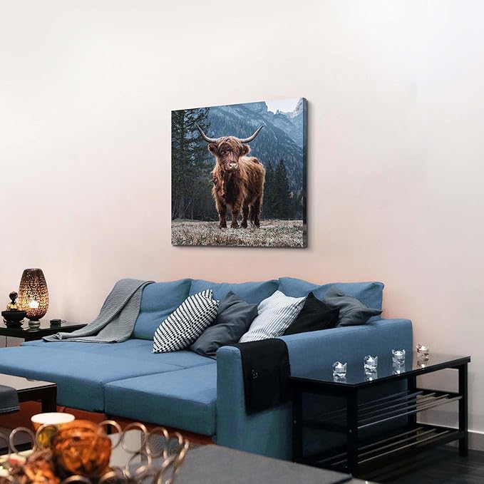 - Stunning Highland Cow Portrait: This 30x30 inches canvas print features a majestic Highland cow against a breathtaking mountain backdrop, bringing the beauty of nature and rustic charm to your home