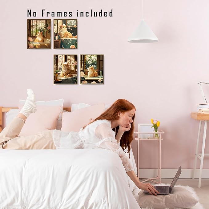 FITIE Funny Orange Cat Bathroom Wall Art Prints Set of 4, Vintage Floral Funny Orange Cat in Bathtub Wall Art Posters for Bathroom Washroom Restroom Decor, 8x10 Unframed