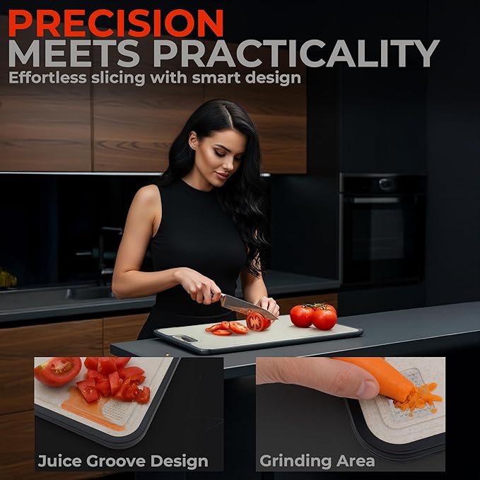 - ใ๐๐๐ฏ๐ข๐ง๐ -๐๐ข๐ฆ๐ ๐๐๐ฌ๐ข๐ ๐งใBuilt-in juice groove and garlic grinding area of wheat straw PP cutting board, deep groove that doesn't spill liquids, can store 200ml liquid, and milling zone for garlic and ginger grinding saves time in your cooking.