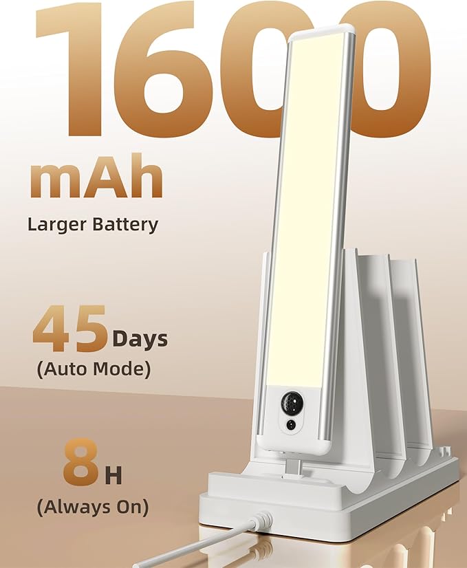 - Rechargeable Battery & Smart Charging Base: Each light includes a 1600mAh rechargeable battery that lasts up to 45 days in Auto Mode or 8 hours in Always-On. The 3-slot USB-C dock charges multiple rechargeable lights at once without clutter, and can also power phones or headphones—great for keeping your kitchen organized and devices ready