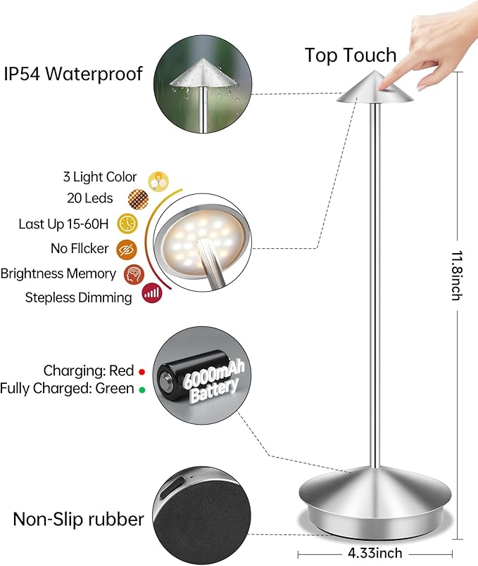 - 【Sincere and Reliable After-sales Service】Mordern Cordless Led Table Lamp,Thick material and anti-slip pads on the base make it not easy to be blown over by high winds, and the silicone plug at the charging port prevents water and dust from attacking it, which is perfect for outdoor use. We provide you with long-term after-sales guarantee, if you have any questions please feel free to send us an email through Amazon, we will give you a satisfactory solution!