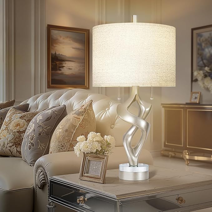 - ATTRACTIVE DESIGN SCULPTURAL TABLE LAMPS: Unique irregularly resin table lamp body, table lamp set of 2 has elegant design, antique silver leaf finish, non-fading. High quality lamps set of 2, clear crystal with metal heavy base, anti slip pad stick on lamp base, sturdy & reliable table lamp, perfect aesthetic for your room design!