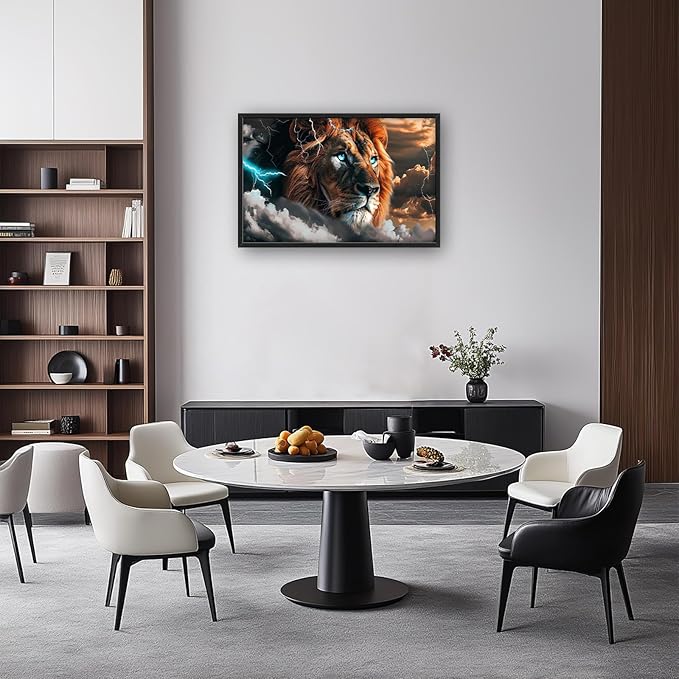 - 【Unique Design】A majestic lion with piercing blue eyes stands atop clouds against the backdrop of an ominous, stormy sky. The lightning illuminates its regal features and muscular form as it stands ready to hunt in this powerful digital artwork in the style of the artist.