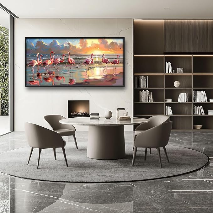 - 【Unique Design】A group of pink flamingos wade in the shallow waters near an empty beach at sunset, in the style of an acrylic painting, a detailed and realistic depiction of their elegant forms against the vibrant sky, with reflections on the water creating a serene atmosphere, a tranquil coastal scene with a touch of whimsy.
