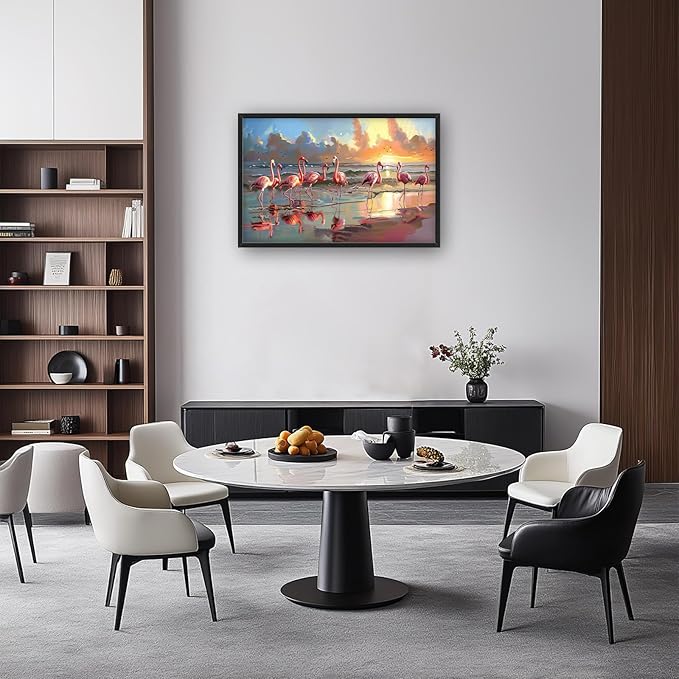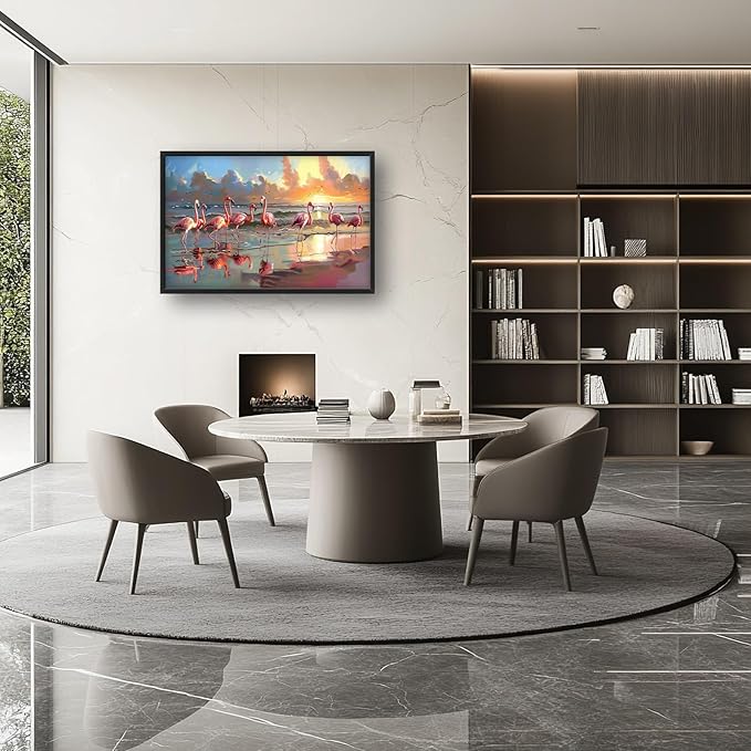 - 【Unique Design】A group of pink flamingos wade in the shallow waters near an empty beach at sunset, in the style of an acrylic painting, a detailed and realistic depiction of their elegant forms against the vibrant sky, with reflections on the water creating a serene atmosphere, a tranquil coastal scene with a touch of whimsy.