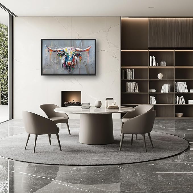 - 【Unique Design】Abstract painting of a colorful bull's face, a longhorn cow's head, with oil paint splatters and drips, against a neutral background. High resolution, high detail, a masterpiece.
