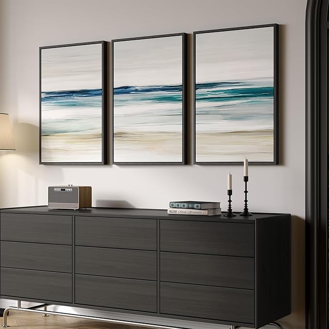 - Framed Abstract Coastal Wall Art: This is a set of 3 framed beach abstract wall paintings designed in an abstract landscape style. Measuring 24x36 inches each, these large art pieces on canvas feature peaceful ocean landscapes and are perfect for decorating a room to add more peace and artistry to your room