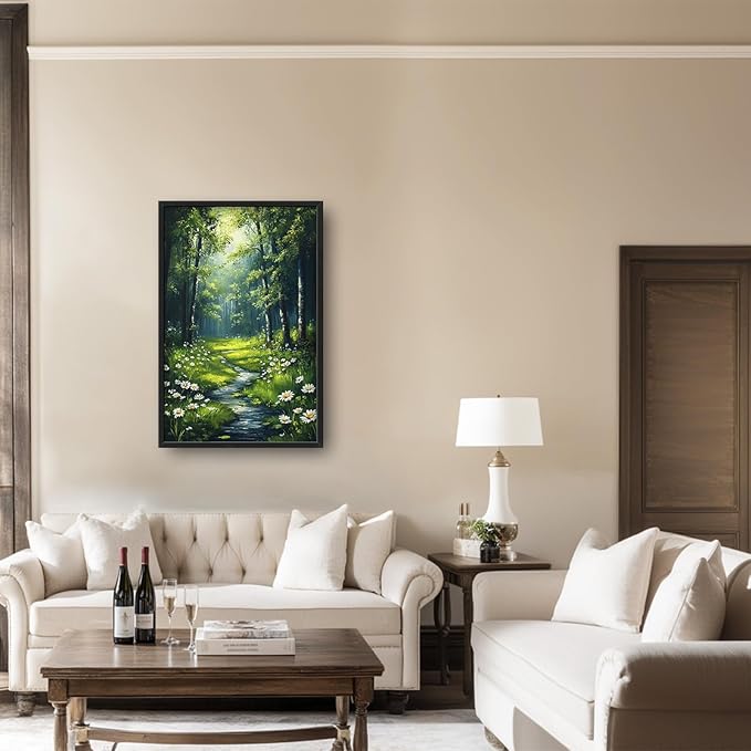 Green Forest Wall Art for Living Room, Large Tree Vertical Canvas Wall Decor, Daisy Flowers Pictures Framed Painting, Landscape Artwork for Bedroom Office Home Decor 36L'' × 24W''