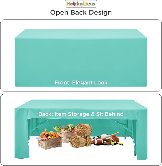 - Open Back Design: Holidayideas table cover completely hides the table on the front and sides, provides a professional look for a display table, service table, or other similar types of event purposes. The Our 3-sided tablecloth provides you with a handy place to hide excess giveaways at trade shows and registration areas and compared with normal fitted tablecloths, the open back design tablecloth allows you to sit comfortably behind the table.