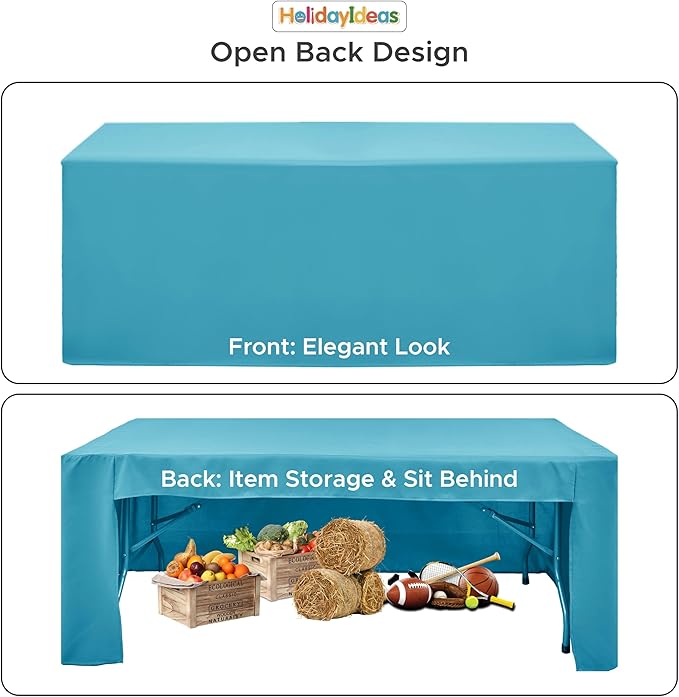 - Open Back Design: Holidayideas table cover completely hides the table on the front and sides, provides a professional look for a display table, service table, or other similar types of event purposes. The Our 3-sided tablecloth provides you with a handy place to hide excess giveaways at trade shows and registration areas and compared with normal fitted tablecloths, the open back design tablecloth allows you to sit comfortably behind the table.