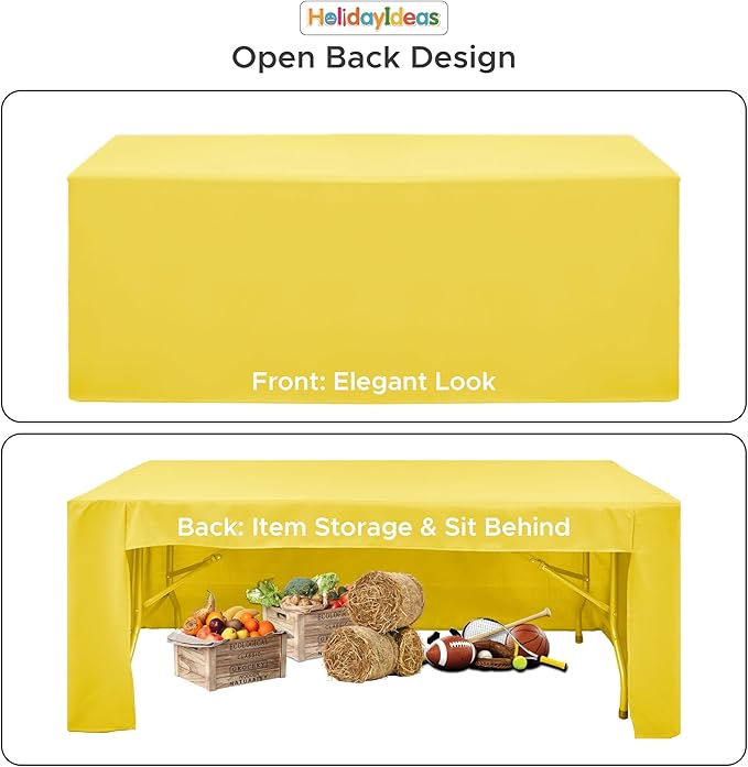- Open Back Design: Holidayideas table cover completely hides the table on the front and sides, provides a professional look for a display table, service table, or other similar types of event purposes. The Our 3-sided tablecloth provides you with a handy place to hide excess giveaways at trade shows and registration areas and compared with normal fitted tablecloths, the open back design tablecloth allows you to sit comfortably behind the table.