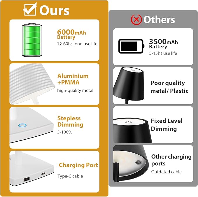 - 【Rechargeable & 6000mAh Power Bank】The Cordless table lamps can also serve as a power bank for smartphone or mobile devices in emergency. environmental protection, low power consumption, has passed the safety certification , full charge can be used for 12-60 hours, is the first choice for emergency backup power in case of sudden power failure.