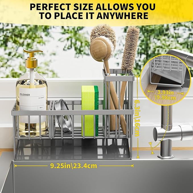 - 【SMALL VOLUME】 Cisily sponge holder is suitable for kitchens with limited space. It measures only 9.25"*3.97"*6.37", Holds a detergent bottle, a sponge ball and sink stopper. With an extra upgraded brush holder that can hold up to 4 small and large sized brushes, with the Cisily Sink caddy you can save countertop space perfectly.