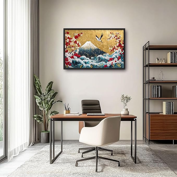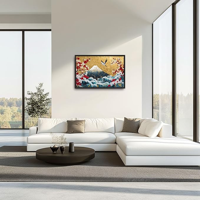 Japanese Large Wall Art for Living Room, Fuji Mountain Oversized Wall Decor Pictures, Ocean Wave Framed Canvas Print Painting, Vintage Artwork for Bedroom Office Home Decor 36"x24"