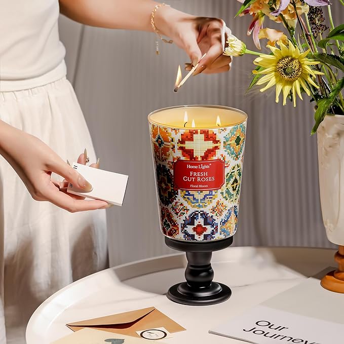 HomeLights 3-Wick Candles for Home Scented - 34oz Soy Wax Blend Candle Long-Lasting Fragrance, Bohemian Natural Textures Home Decor and Housewarming Gifts, Fresh Cut Roses
