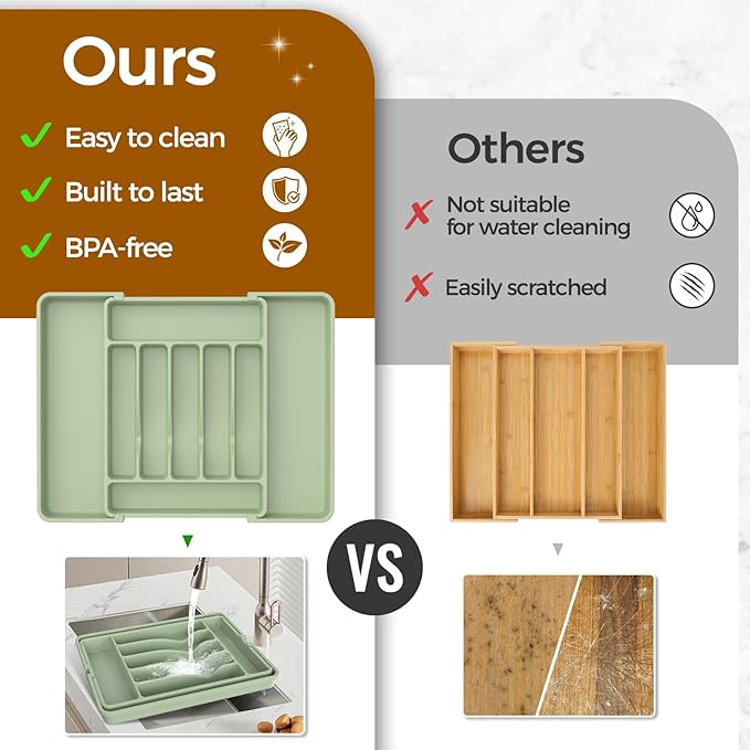 - 【Adjustable Size】:The width of the utensil drawer organizer expands from 12.4" to 21", perfectly fitting most standard drawers. (Measure your drawer before buying for the best fit).