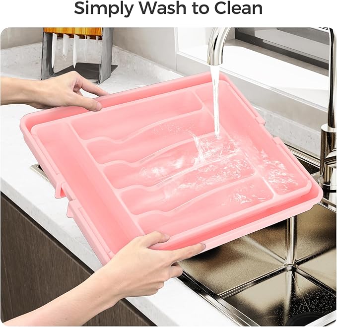 Extra Large Expandable Silverware Organizer, BPA-Free Food-Safe Cutlery Flatware Organizer, Kitchen Utensil Drawer Organizer, Adjustable Silverware Holder for Spoons Forks Knives, Pink