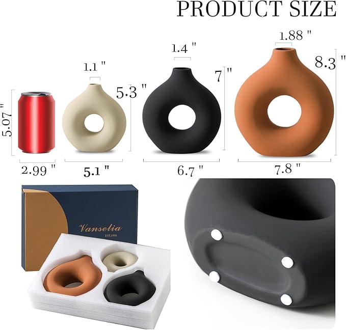 - 【Artful & Playful Decor】Bring charm and creativity into your home with our donut-shaped ceramic vases — a perfect blend of style and functionality. Their unique hollow design adds a modern touch, making them ideal for enhancing your dining table, living room, or office. Whether showcasing fresh flowers, dried arrangements, or standing alone as decorative pieces, these versatile vases effortlessly elevate any space with their artistic appeal.