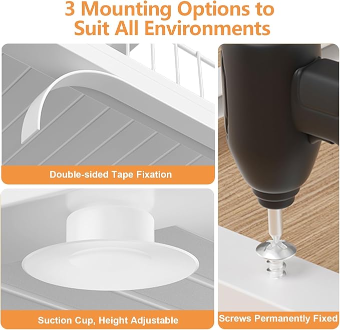 - 3 secure mounting options: Kitchen cabinet organizer including (1) strong suction cups for non-destructive mounting (2) waterproof tape for semi-permanent mounting (3) screws for permanent fixing on tile/wood surfaces