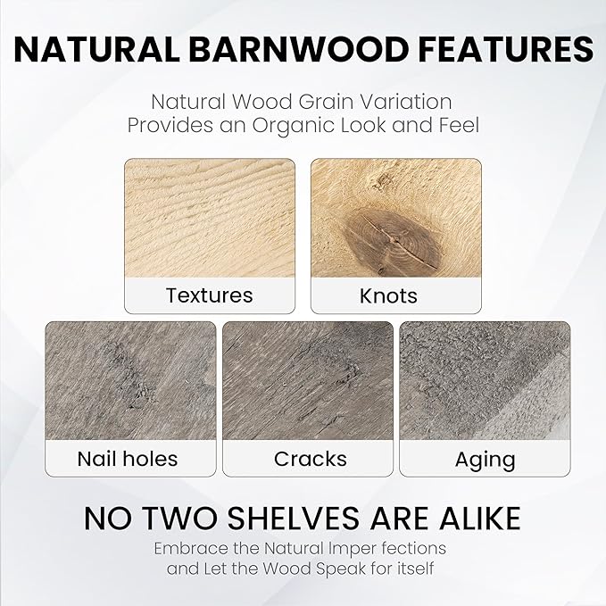 - Thick Reclaimed Wood Shelves: Fun Memories floating shelves are handcrafted from 1.4" thick solid reclaimed wood, measuring 24" x 8". Natural barnwood features—such as nail holes, discoloration, and surface wear—make each shelf a one-of-a-kind, authentic décor accent