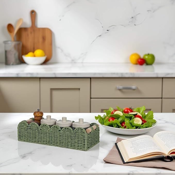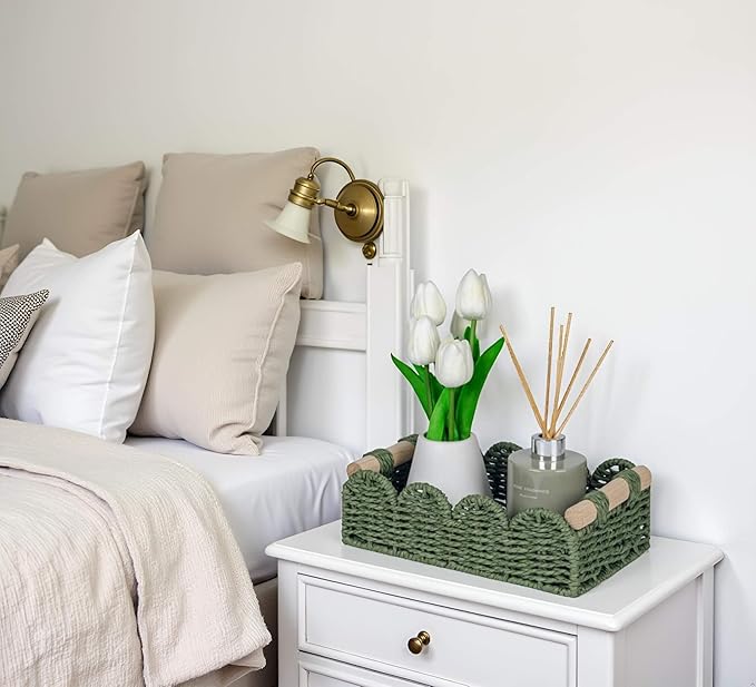 - MULTIPURPOSE USE: Our scalloped edge paper rope decor basket add personality and charming addition to bedroom, living room, bathroom and space-floating shelves, over toilet storage shelf, end table, nightstand,storage cabinet, bookcase and more, also serve well to small items, beauty products, cleaning supplies, and more