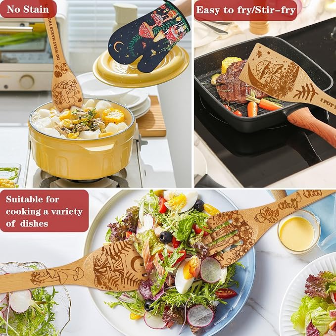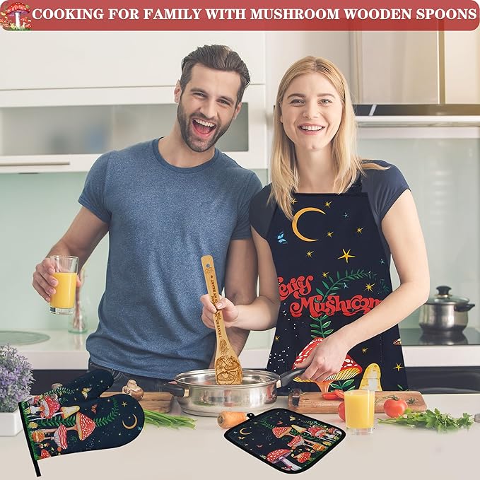 - MUSHROOM WOODEN SPOONS FOR COOKING:Our 8PCS wooden cooking utensil set is designed for mushroom lovers.It contains 5 bamboo spoons with different functions,including slotted turner spatula、solid spoon、slotted turner spatula、fork spoon、single spatula、apron and oven mitt potholder.Each spoon has a unique lelfante pattern and interesting sayings about mushroom.It can bring a different cooking experience for mushrooms lovers.