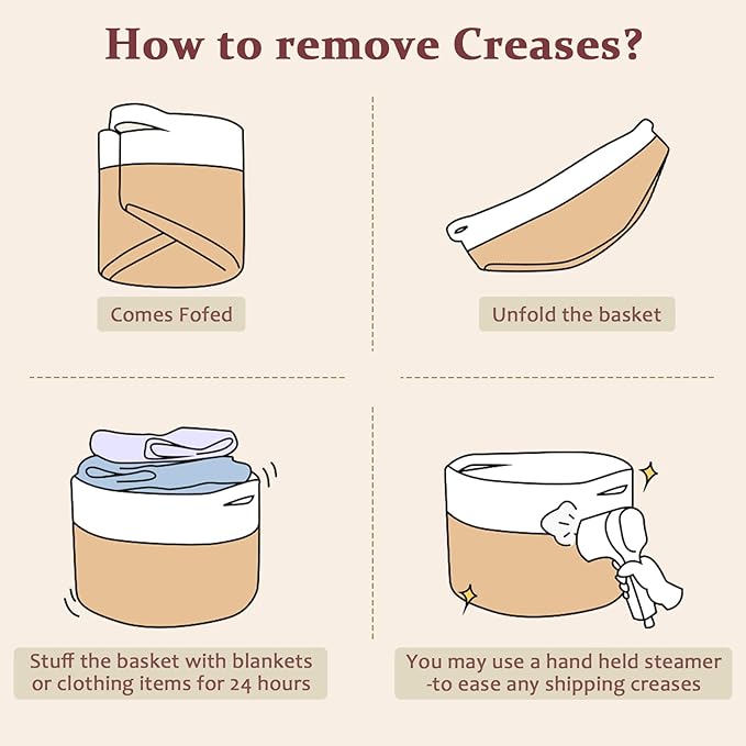 - NOTE: The home woven storage basket is folded when shipping, it will turn back to its elegant shape quickly when you fill in some towels or clothing , and also iron is a good idea (However, the bottom cannot be ironed and washable)