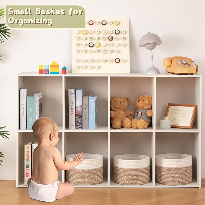 - Versatile Small Storage Basket:9.8×9.8×7.1inch, convenient to store more daily necessities.Our baskets are handmade with flexible material, which may result in slight size variations. It is a perfect storage basket for living room, bedroom, bathroom, baby room, utility room, playroom, classroom. Store household items (towels, toiletries, etc.),Office Supplies, fruit, snacks , books, baby diapers. Use for storage organization to keep your living space tidy