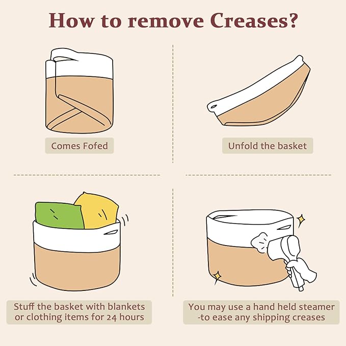 - NOTE: The home woven storage basket is folded when shipping, it will turn back to its elegant shape quickly when you fill in some towels or clothing , and also iron is a good idea (However, the bottom cannot be ironed and washable)