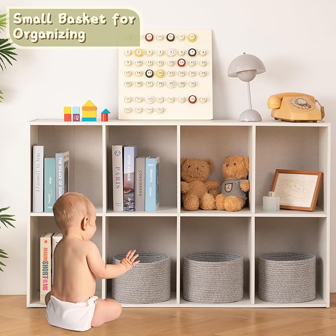 - Versatile Small Storage Basket:9.8×9.8×7.1inch, convenient to store more daily necessities.Our baskets are handmade with flexible material, which may result in slight size variations. It is a perfect storage basket for living room, bedroom, bathroom, baby room, utility room, playroom, classroom. Store household items (towels, toiletries, etc.),Office Supplies, fruit, snacks , books, baby diapers. Use for storage organization to keep your living space tidy