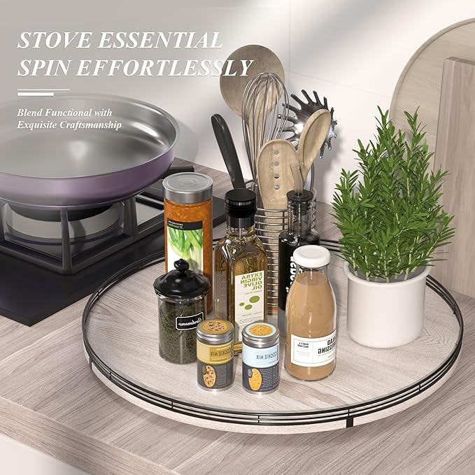 - 360 RATATING & MAXIMIZE SPACE: The base is made of solid wood and the spinning mechanism is made of steel ball bearings, which are well-built and allow for 360° smoothly spin. Making it super easy to access items at the back of your cabinet without having to remove everything in front. You can use it to store spices, condiments, and even small jars, and it keeps everything neatly in place.