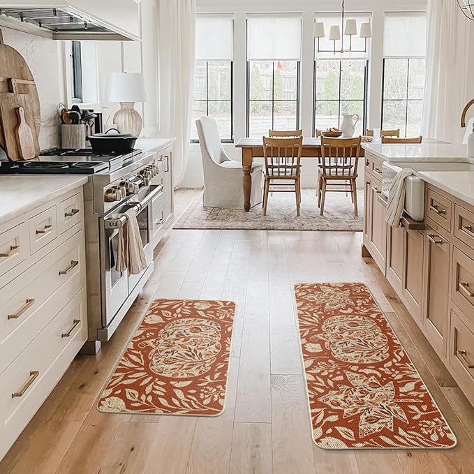- 2 PIECES INCLUDE: Measures 17" x 29" and 17" x 47", features 0.25" slim. One long and one short making them just the right size for the kitchen. Our stylish kitchen mats make a beautiful addition to your kitchen, dining room, craft rooms and office spaces