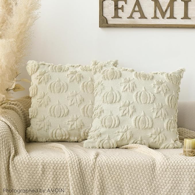 AVOIN colorlife Fall Pumpkin Maple Leaves Beige Throw Pillow Covers, 20 x 20 Inch Seasonal Autumn Thanksgiving Harvest Soft Plush Faux Fur Jacquard Cushion Case Decoration for Sofa Couch Set of 2
