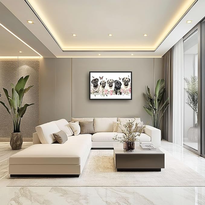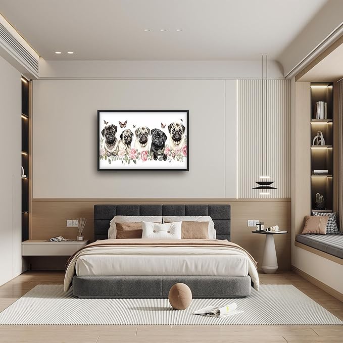 Flintis Large Pug Wall Art Dog Butterfly Pictures Wall Decor Abstract Animal Canvas Painting Print Artwork Decoration Framed for Living Room Bathroom Master Bedroom Office Dining Room 36L x 24W