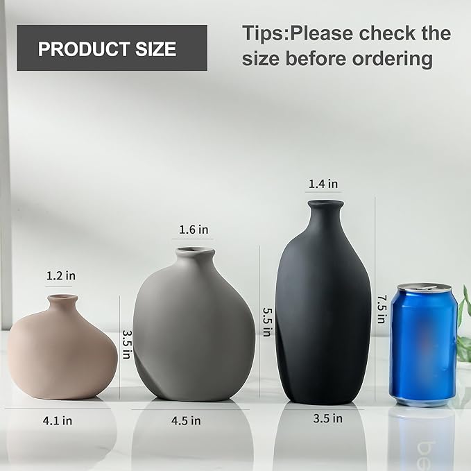 - Home Décor Ceramic Vase – (Dimensions: 7.5” x 3.5”; 5.5”L x 4.5”W; 3.5”L x 4.1”W) This ceramic vase set is a perfect addition to your home decor, effortlessly enhancing any room or interior style. Whether your space leans boho, modern farmhouse, rustic, or cottagecore, these versatile pieces bring a timeless and elegant touch to your living room, bedroom, or entryway.
