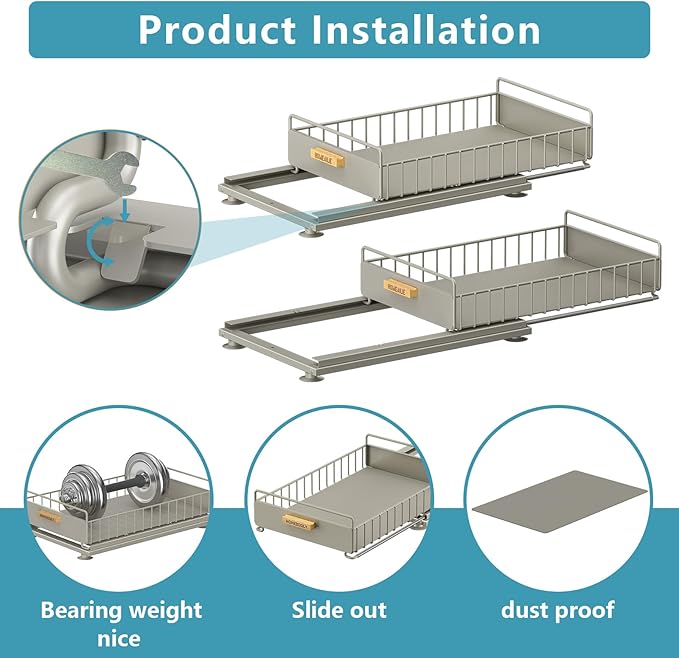 - Full Scene Adaptation: Under organization and storage is suitable for scenes such as under the sink and bathroom basins. It can be used as bathroom cabinet organizer, kitchen organizers and storage, and cleaning supplies organizer