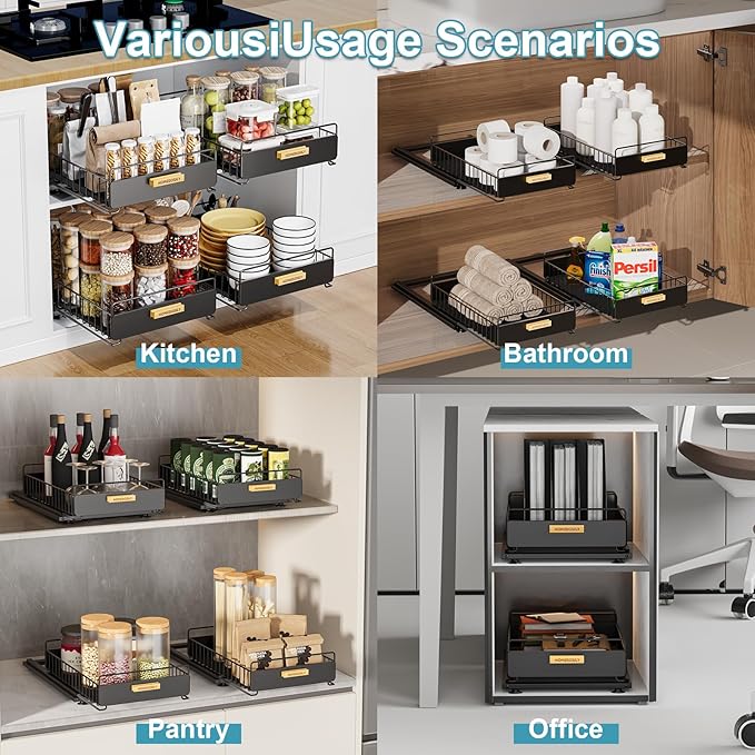- Full Scene Adaptation: Under organization and storage is suitable for scenes such as under the sink and bathroom basins. It can be used as bathroom cabinet organizer, kitchen organizers and storage, and cleaning supplies organizer